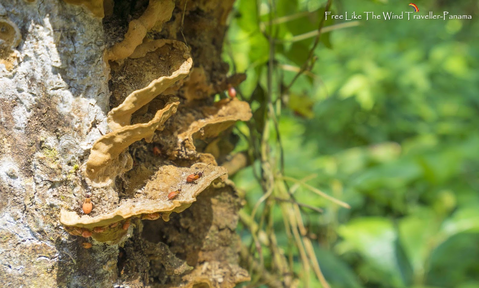 另外在幾棵樹上也可以看到這長的有點像是蘑菇的植物,每片蘑菇上面還爬滿了這橘紅色的小蟲子,感覺這些蘑菇片就是小蟲子的家,可以幫蟲子們遮風避雨,真的是非常的特別。